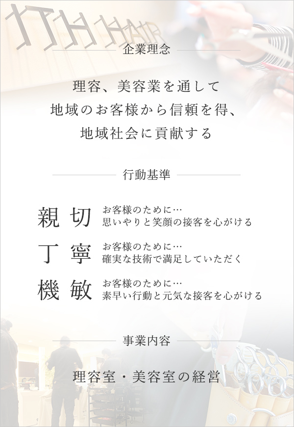 そして、すべての理美容師がこの仕事に誇りを持ち、生涯にわたって働き続けられる場を創造してまいります。